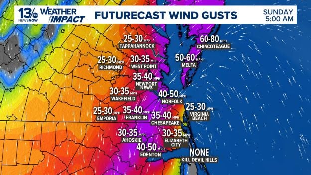 Heavy rain, strong wind and coastal impacts are possible late Saturday through Monday. Major tidal flooding is forecast during Sunday's tide cycles in the Peninsula, according to 13News Now Meteorologist Tim Pandajis.